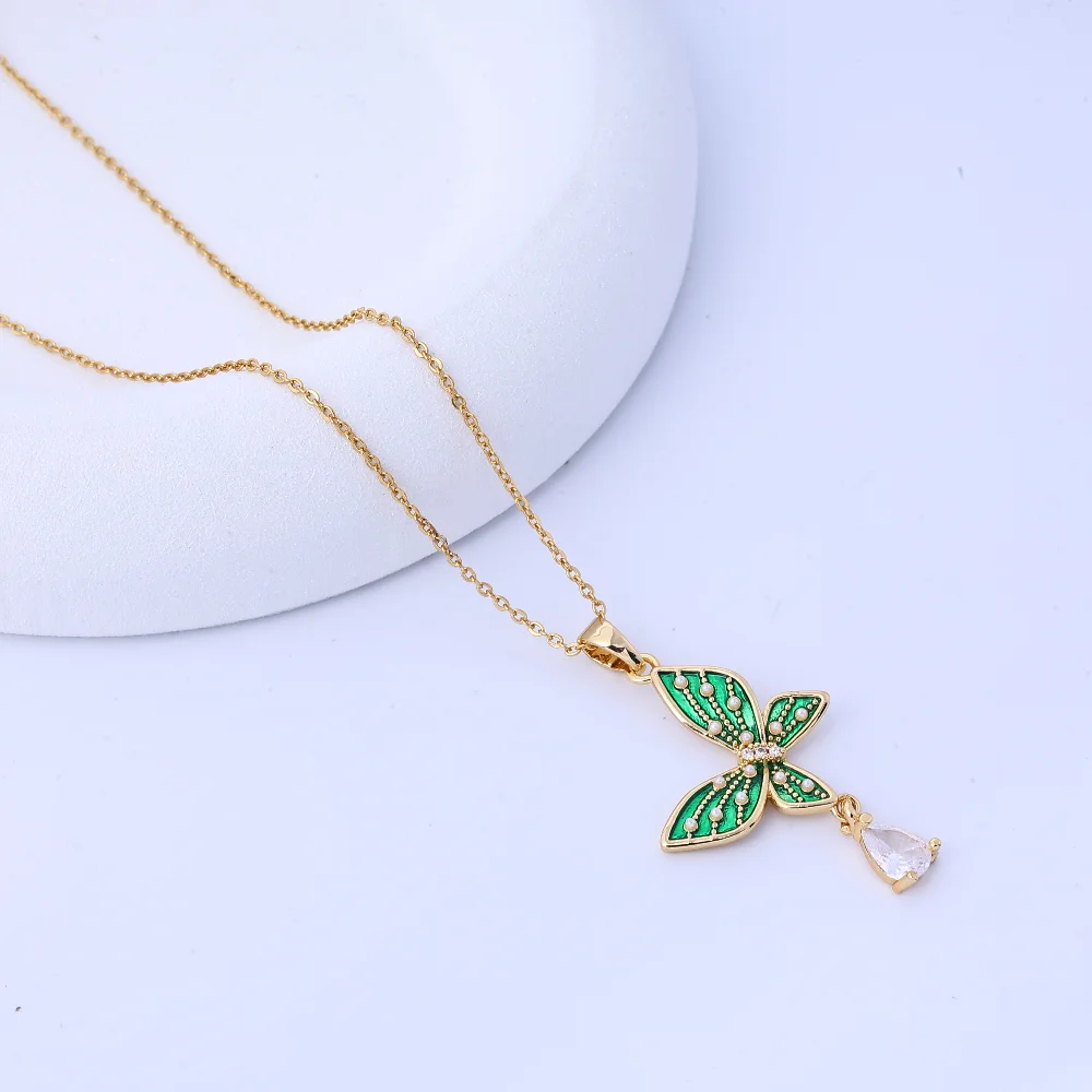 Fashionable and High-End Green Pearl Butterfly Water Droplet Necklace for Female Actors, Elegant Temperament, Versatile Titanium